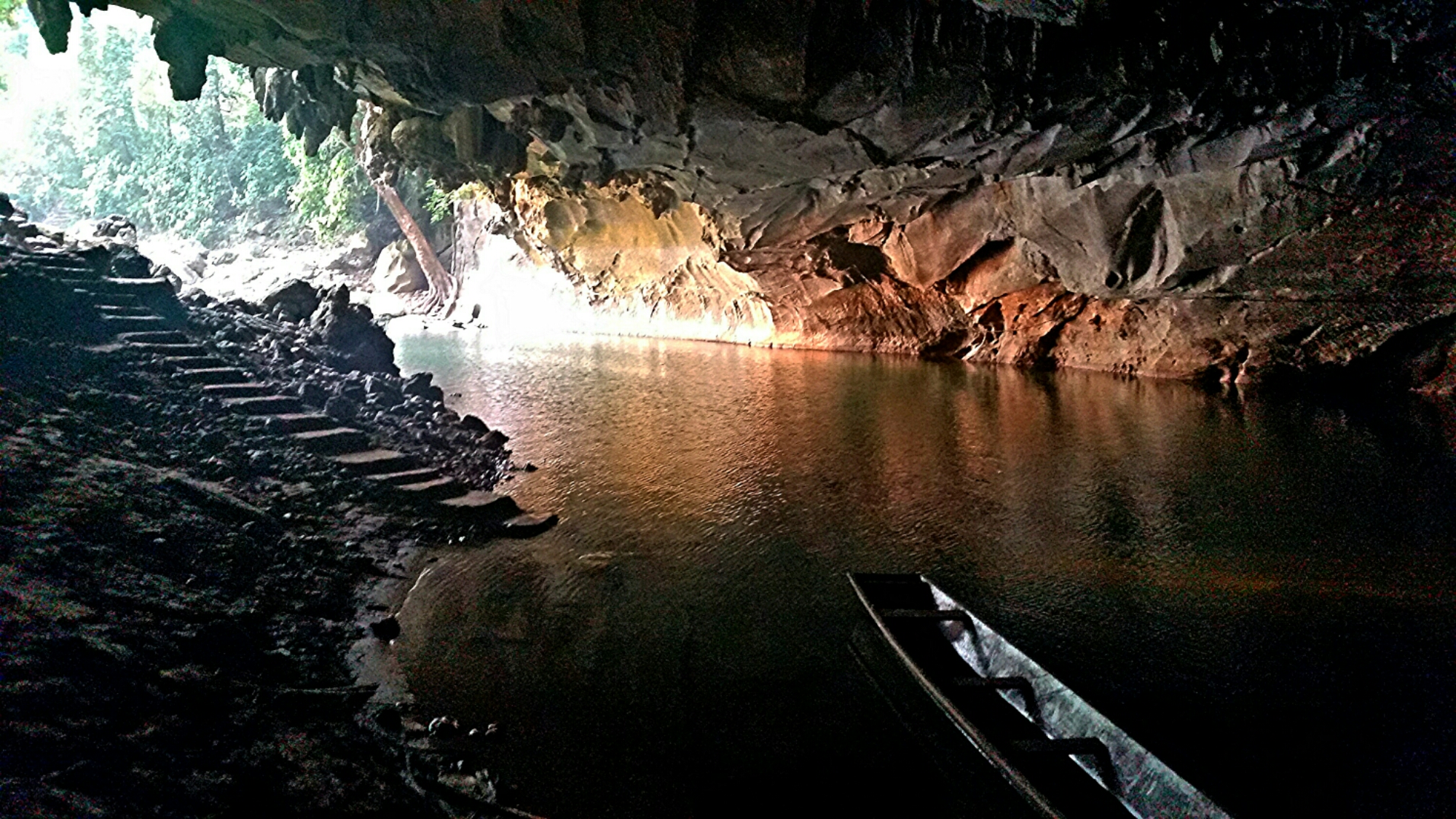 The cave itself was incredible. A long tail boat ride through a subterranean river inside 7.5k long cave. At one point, we moored up to a bank and I was left to wander through this Alice in Wonderland esque land of stalagmites and stalactites alone with nothing for company but my head torch…. a little creepy! In places, we had to get out of the boat and push it; up a waterfall, over some rapids, through a shallow stream… we then emerged out the other side of the cave amongst the mountains, following the river downstream whilst the sun set (and I didn’t see a single beastie).