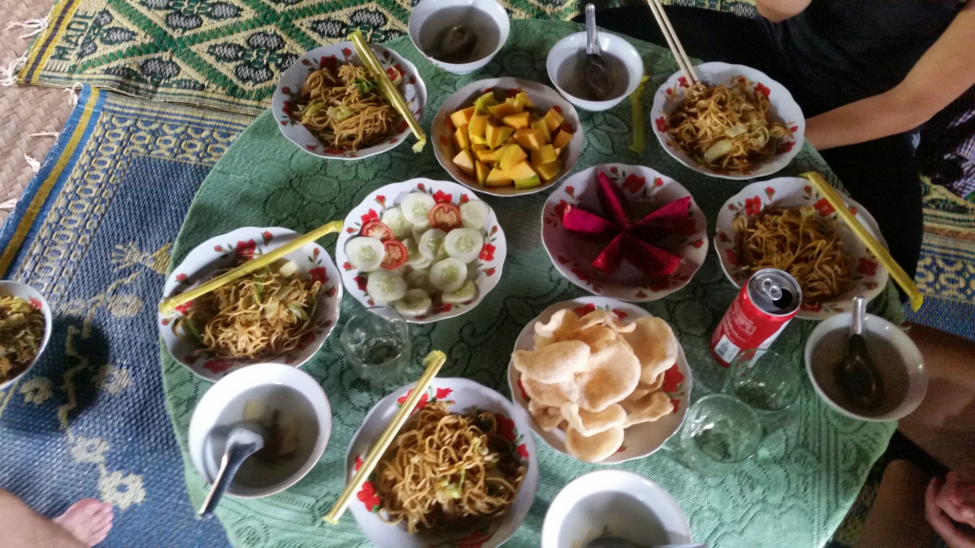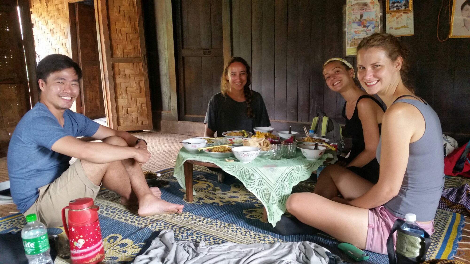 This super friendly man couldn’t speak a word of English but welcomed us into his home with open arms for a lunch around a little table in his elevated bamboo house. We ate a dinner of ginger soup, vegetable fried noodles, tomato and cucumber salad and potato crackers with mango and dragon fruit for dessert all washed down with traditional Burmese tea.